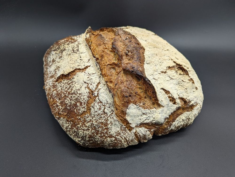 Pain confectionné à base de farine d'Epeautre Type 110 et Froment T110. Levain naturel et sel de guérande. Levure (0,01%) (Certifié Bio. FR-BIO-09) L'intégralité des ingrédients est issue de l'agriculture biologique à l'exception du sel et des algues étants produits de la mer)