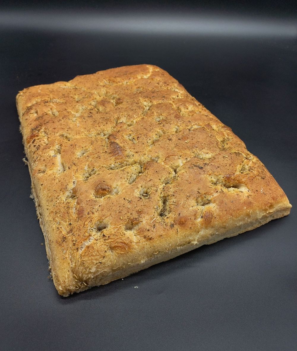 Focaccia à l'ail, huile d'olive et herbes de Provence. (Farine T65) Pain de 1100g (Certifié Bio. FR-BIO-09) à proposer à la pièce ou au poids pour votre clientèle L'intégralité des ingrédients est issue de l'agriculture biologique à l'exception du sel et des algues étants produits de la mer)