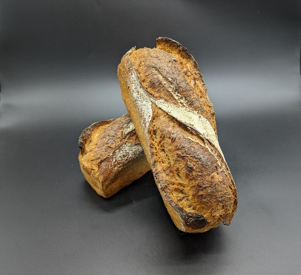 Baguettes de tradition française confectionnées à base de farine Type 65. Levain naturel et Sel de Guérande, Levure (0,01%) (Certifié Bio. FR-BIO-09)