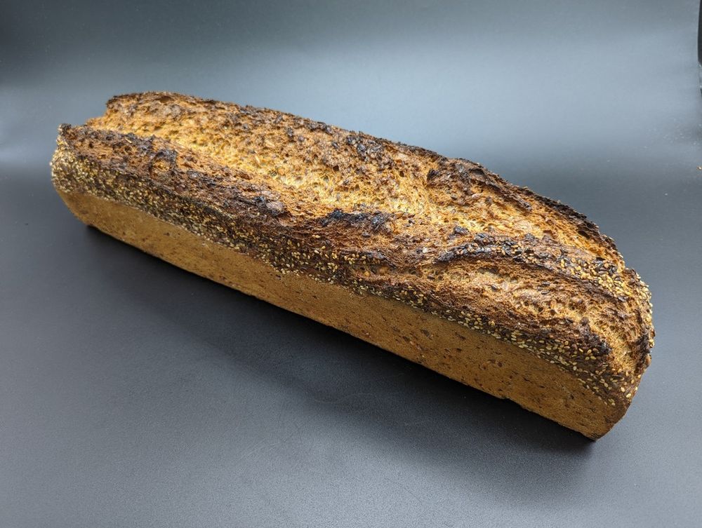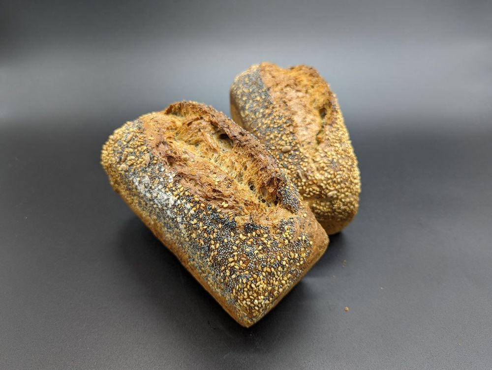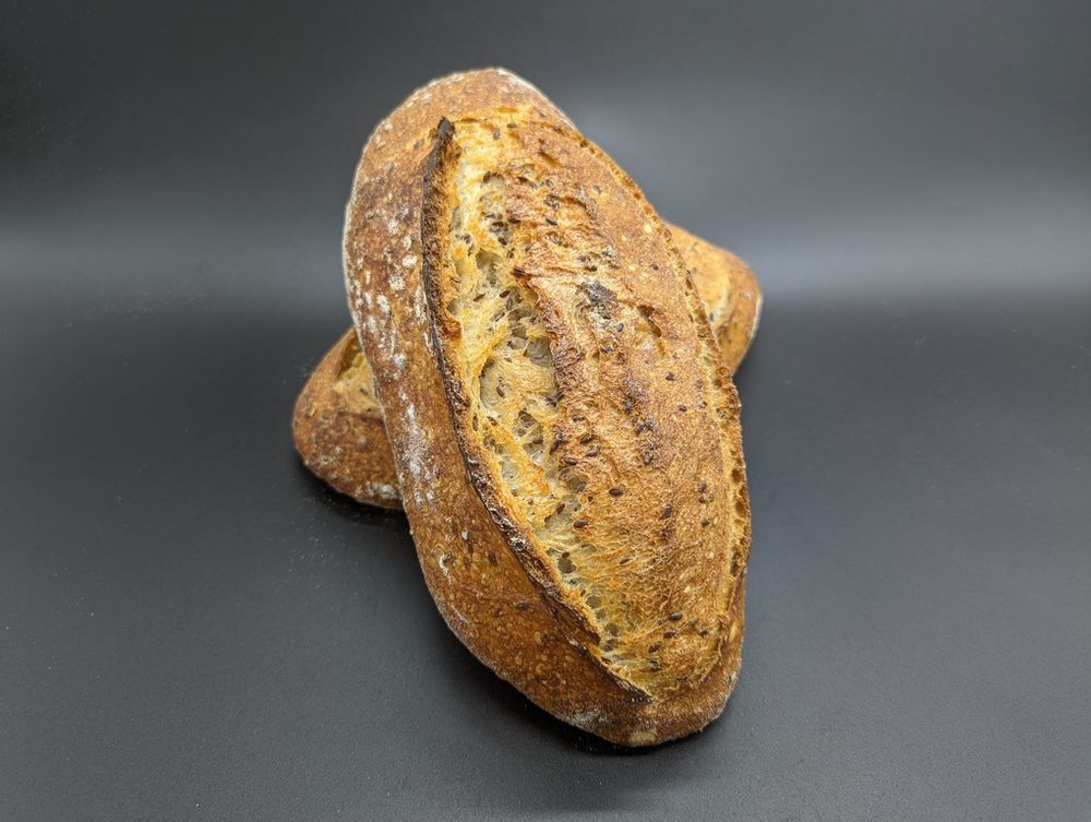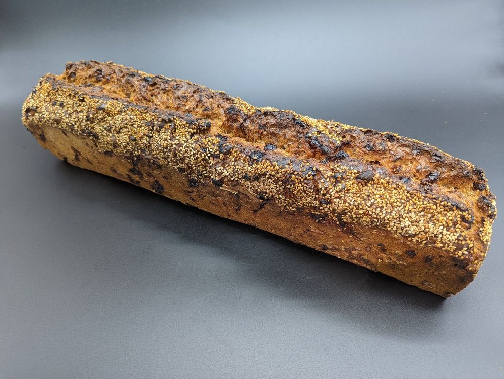 Baguettes de tradition française aux céréales confectionnées à base de farine Type 65. agrémentés d'un mélange de graines, Levain naturel et Sel de Guérande, Levure (0,01%) (Certifié Bio. FR-BIO-09)