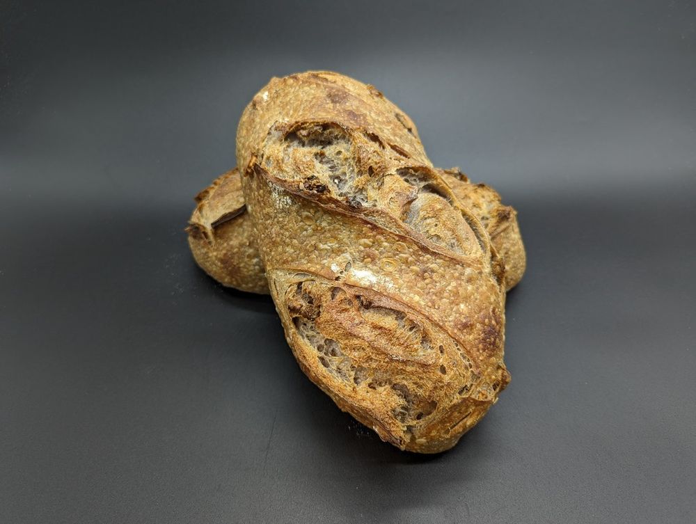 Pain Complet confectionné à base de farine Type 150. Levain naturel et sel de guérande. Levure (0,01%) (Certifié Bio. FR-BIO-09) Indice glycémique:35