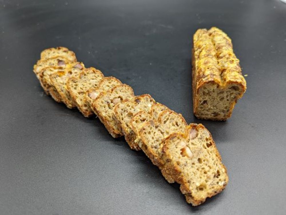 Pain Norvégien agrémenté de lardons et d'emmental (Certifié Bio. FR-BIO-09) L'intégralité des ingrédients est issue de l'agriculture biologique à l'exception du sel et des algues étants produits de la mer)