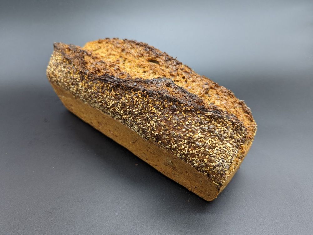 Pain à base de Farine de blé T80, Farine de maïs, Farine d'orge, Farine d'épeautre, farine de seigle T130, Farine de sarrasin, Graines de lin brun, Graines de sarrasin, Graines de tournesol et Graines de millet. Levain naturel et Sel de Guérande. Levure (0,01%) (Vendu au poids). (Certifié Bio. FR-BIO-09) L'intégralité des ingrédients est issue de l'agriculture biologique à l'exception du sel et des algues étants produits de la mer)