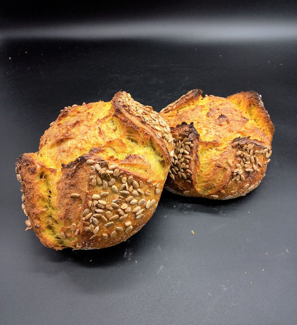 Pain au Curcuma, Noisetttes et Canneberges confectionné à base de farine type 65, sel de guérande. Levure (0,01%) (Poids : 220g) (Certifié Bio. FR-BIO-09) L'intégralité des ingrédients est issue de l'agriculture biologique à l'exception du sel et des algues étants produits de la mer)